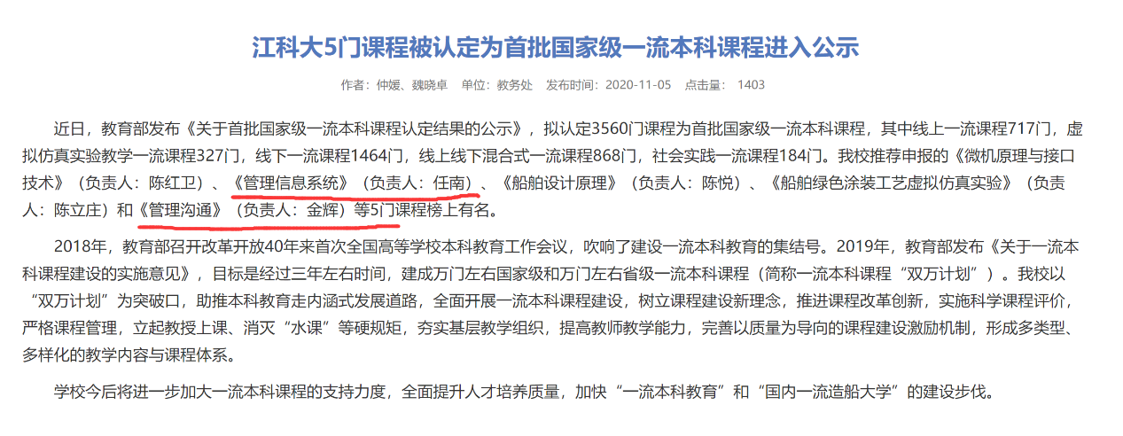 “管理信息系统”与“管理沟通”入选首批国家一流课程,《船舶集成制造管理理论与方法》获批省立项重点教材。