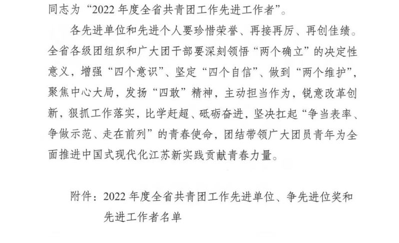 近日,共青团江苏省委印发《关于2022年度全省共青团工作综合评估结果的通报》(团苏委发〔2023〕3号),我校团委获评“2022年度全省共青团工作先进单位”,校团委副书记张冬冬同志获评“2022年度全省共青团工作先进工作者”。据悉,经综合评估,全省共有团南京市委等116个单位获评“2022年度全省共青团工作先进单位”,11个单位获评“2022年度全省共青团工作争先进位奖”,116名同志获评“2022年度全省共青团工作先进工作者”。