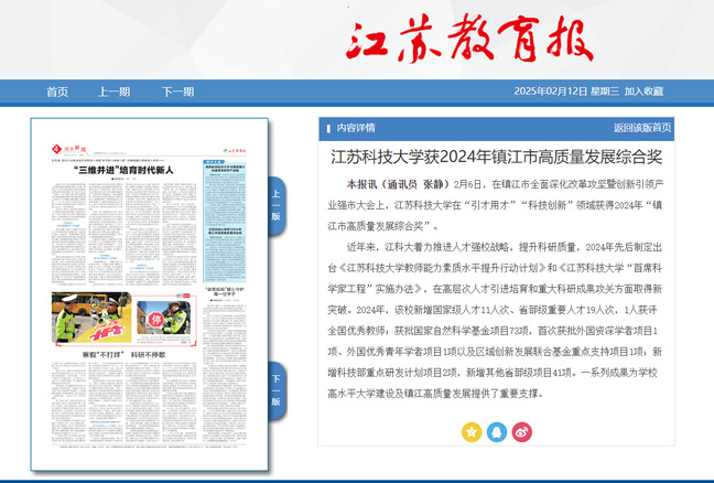 近年来,江科大着力推进人才强校战略,提升科研质量,2024年先后制定出台《安博网页版登录入口教师能力素质水平提升行动计划》和《安博网页版登录入口“首席科学家工程”实施办法》,在高层次人才引进培育和重大科研成果攻关方面取得新突破。2024年,该校新增国家级人才11人次、省部级重要人才19人次,1人获评全国优秀教师;获批国家自然科学基金项目73项,首次获批外国资深学者项目1项、外国优秀青年学者项目1项以及区域创新发展联合基金重点支持项目1项;新增科技部重点研发计划项目2项,新增其他省部级项目41项。一系列成果为学校高水平大学建设及镇江高质量发展提供了重要支撑。