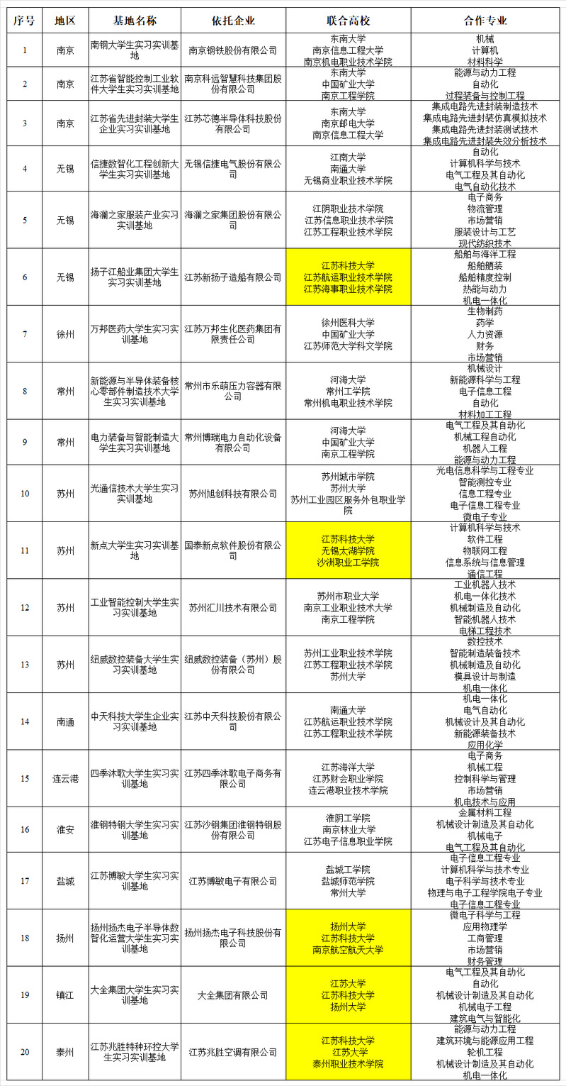 5月15日,江苏省工信厅公示了首批江苏省大学生企业实习实训基地支持名单,全省共计20家企业入围。其中,我校有5家依托企业获批省级大学生企业实习实训基地,获批数量位居全省高校第一。