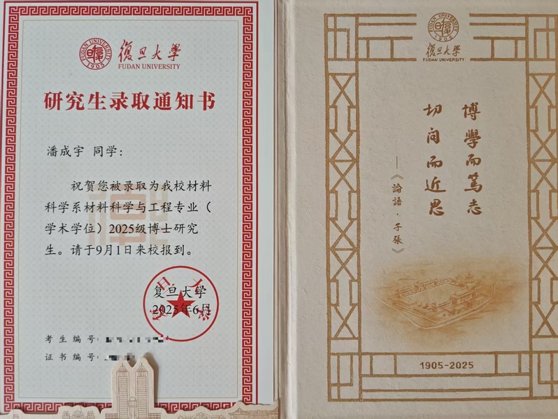 2025年7月, 一封来自复旦大学的博士录取通知书悄然抵达镇江,收件人潘成宇。这位来自我校2021级材料专业的研究生用十一年的光阴完成了一场三级跳圆梦顶尖学府博士生的非凡旅程。